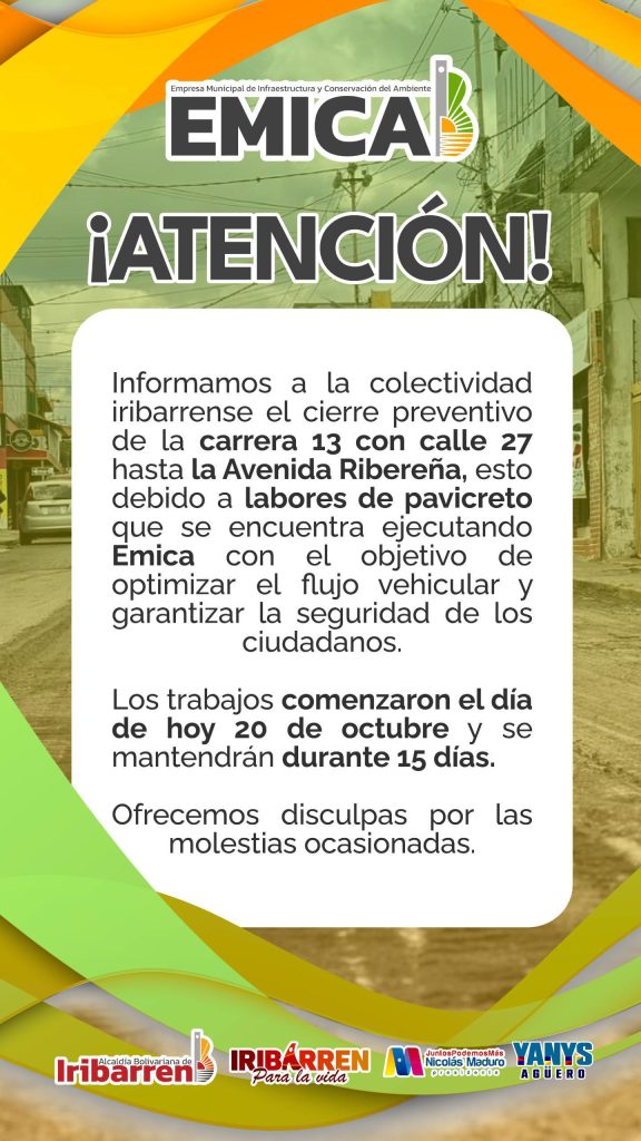 «Informamos a la colectividad iribarrense el cierre preventivo de la carrera 13 con calle 27 hasta la avenida Ribereña, esto debido a labores de pavicreto que se encuentra ejecutando Emica con el objetivo de optimizar el flujo vehicular los y garantizar la seguridad de ciudadanos. Los trabajos comenzaron el día de hoy 20 de octubre y se mantendrán durante 15 días. Ofrecemos disculpas por las molestias ocasionadas», se lee en el comunicado.