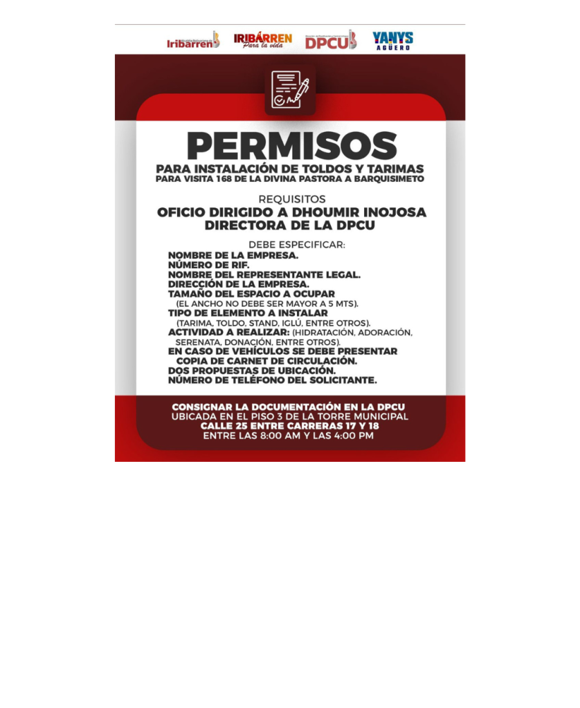 Barquisimeto, 13 de noviembre de 2025. La Alcaldía del municipio Iribarren, a través de la Dirección de Planificación y Control Urbano (DPCU), informó que ya está abierto el proceso de recepción de solicitudes para la instalación de tarimas, toldos, stands e iglús en el marco de la procesión número 168 de la Divina Pastora.