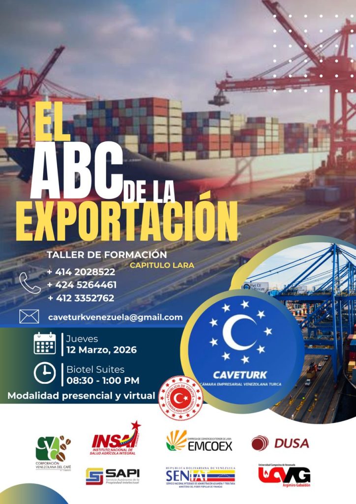 Barquisimeto, 9 de marzo de 2026.- La Cámara de Integración Económica Venezolano Turca (CAVETURK) anuncia la realización del Taller «ABC de la Exportación»: Capítulo Lara.