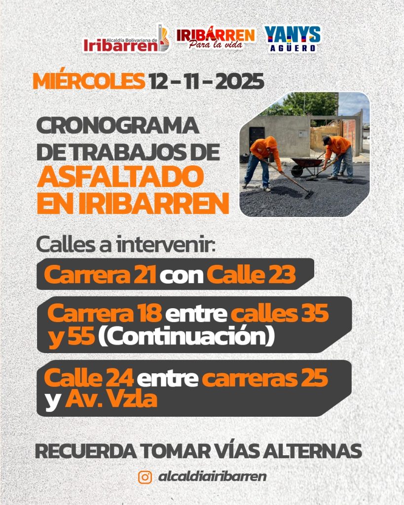 Barquisimeto, 12 de noviembre de 2025.- En el marco de la semana 15 del Plan de Rehabilitación Vial impulsado por la Alcaldía del municipio Iribarren, se ejecutan trabajos de bacheo y aplicación de asfalto en distintos sectores de Barquisimeto, específicamente en: