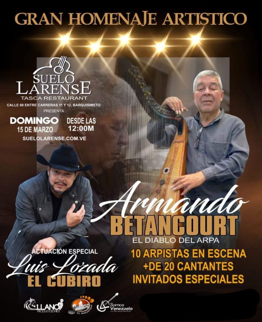 Barquisimeto, 7 de marzo de 2026.- El reconocido arpista venezolano Armando Betancourt será homenajeado el próximo domingo 15 de marzo de 2026 en el restaurante Suelo Larense, en la ciudad de Barquisimeto, en un evento especial que busca reconocer su trayectoria artística de más de 47 años dedicados a la música venezolana.