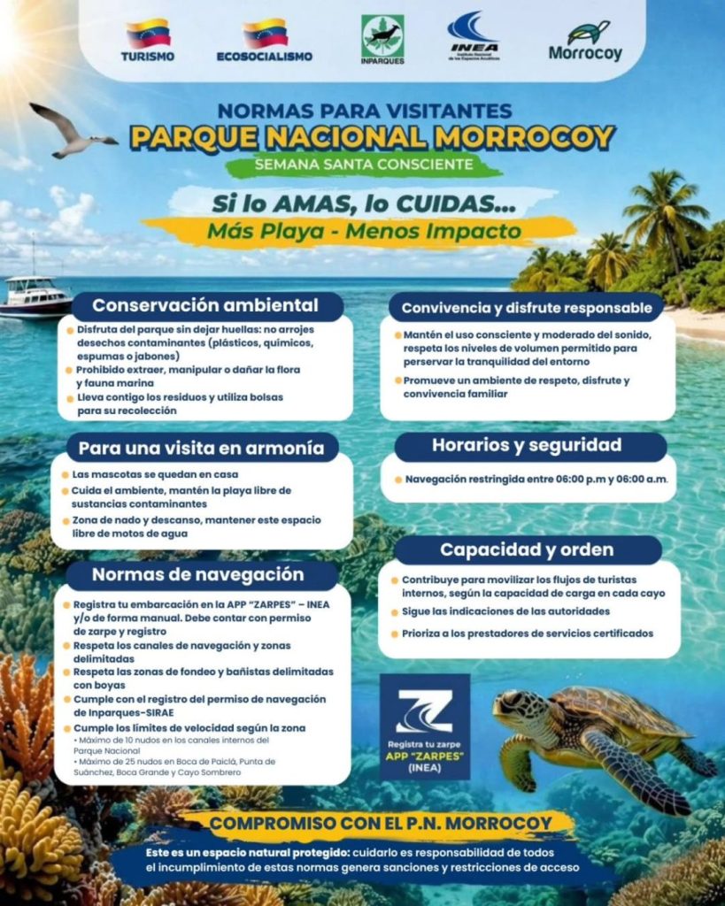 Igualmente, se recordó la importancia de respetar los canales de navegación, las zonas de fondeo y las áreas destinadas a bañistas, las cuales están delimitadas con boyas. Los límites de velocidad fijados son de un máximo de 10 nudos en los canales internos del parque y hasta 25 nudos en sectores como Boca de Paiclá, Punta de Suánchez, Boca Grande y Cayo Sombrero.